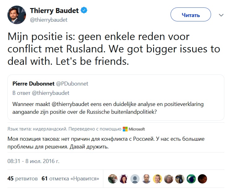 "Боде все равно, и он гораздо более позитивен по отношению к Москве. Вы можете рассчитывать на то, что его заявления будут с благодарностью восприняты в России, чтобы поставить под сомнение расследование MH17, как это часто случалось"