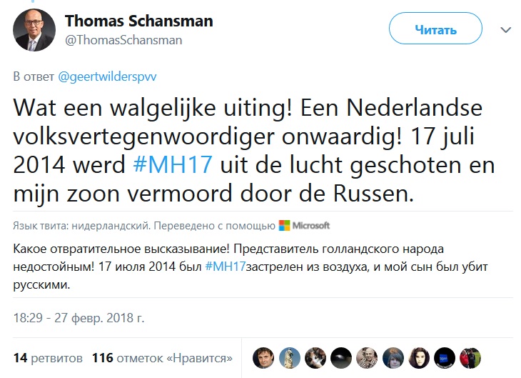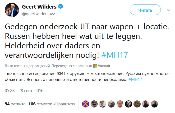 Gert Wilders, не критиковал расследование JIT, называл его тщательным и призывал Россию объяснится.